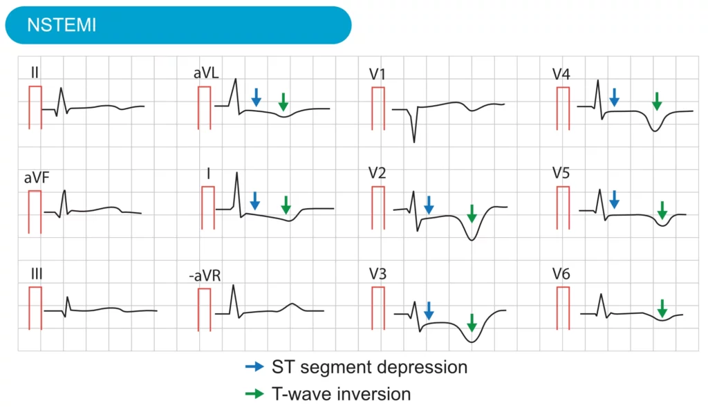 Kjennetegnet på NSTE-ACS (NSTEMI) i EKG er horisontale eller nedadgående ST-senkninger (depresjoner) og/eller T-bølgeforandringer. T-bølgeforandringene kan manifestere seg som T-bølgeinversjoner (negative T-bølger) eller avflatning. Det er en viktig klinisk distinksjon at i motsetning til ved STEMI, vil ikke EKG-avledningene med ST-segmentdepresjoner ved NSTE-ACS nødvendigvis peke direkte på det iskemiske området eller hvilken arterie som er affisert. ST-senkninger i V1-V4 betyr ikke nødvendigvis fremre veggs iskemi, men kan være et uttrykk for diffus subendokardial iskemi («summation vector»). ST-segmentdepresjoner er derfor mindre egnet til å lokalisere «culprit-arterie» enn ST-elevasjoner. Se Lokalisering av akutt hjerteinfarkt og culprit-arterie for detaljer om hvordan man lokaliserer iskemi/infarkt ved hjelp av EKG.