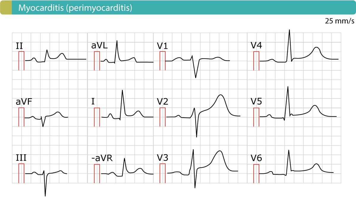Myokardittog perikarditt opptrer ofte sammen. Tilstanden kan gi sterke retrosternale brystsmerter som forverres ved inspirasjon og ryggleie, noe som skiller seg klinisk fra typiske iskemismerter. EKG-forandringene kan likevel minne om STEMI, men med viktige forskjeller: