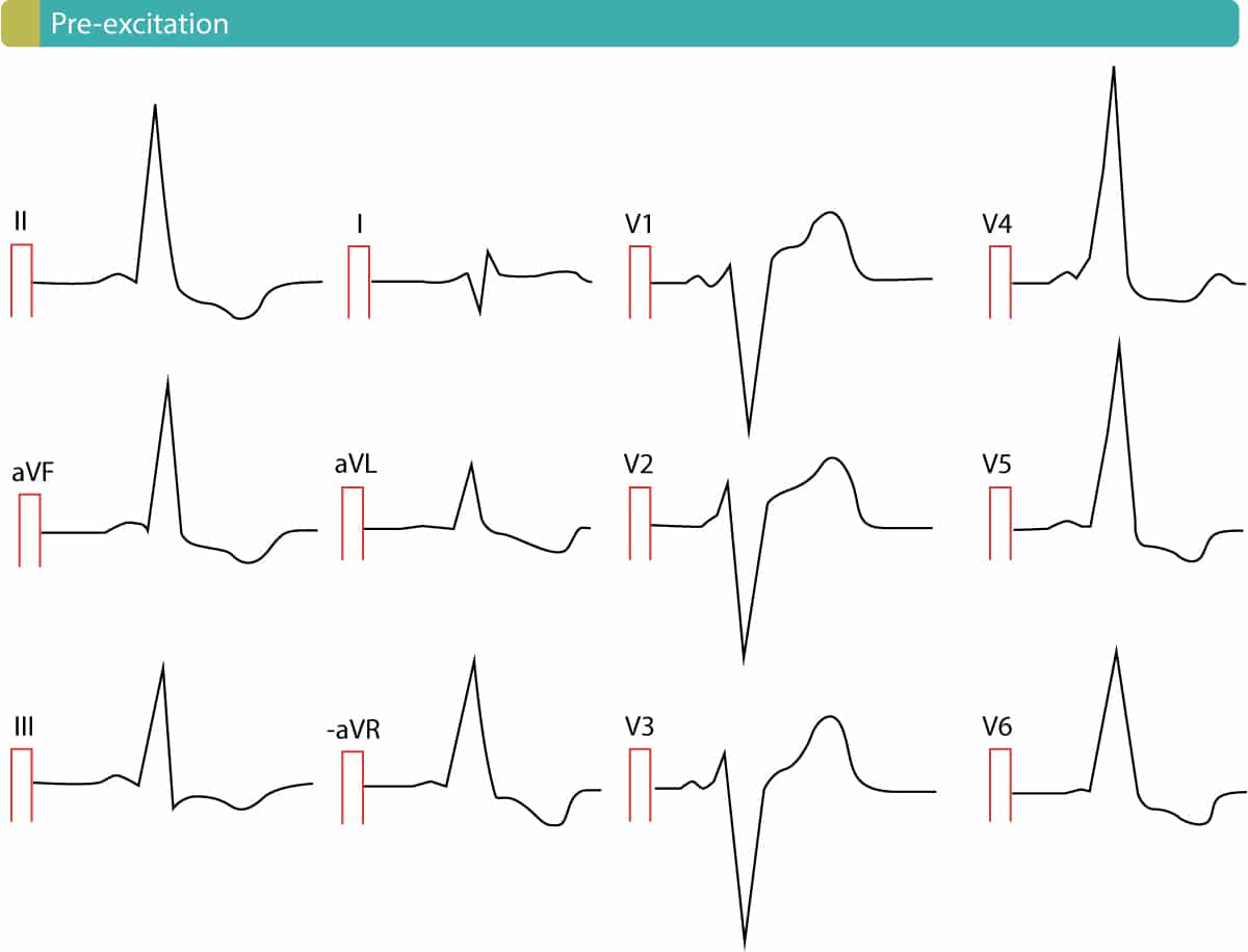 Ved preeksitasjon aktiveres deler av ventrikkelmyokardiet for tidlig via en aksessorisk ledningsbane (bunt av Kent). Dette gir en unormal depolarisering (delta-bølge) som nødvendigvis fører til en unormal repolarisering. Dette resulterer i sekundære ST-T-forandringer som ofte inkluderer ST-elevasjoner og ST-depresjoner som er diskordante til delta-bølgen og QRS-komplekset. Preeksitasjon kan også gi «pseudo-Q-bølger» (negativ delta-bølge) som feilkes som gammelt infarkt. Se figur 11. Se Preeksitasjon og WPW for detaljer.