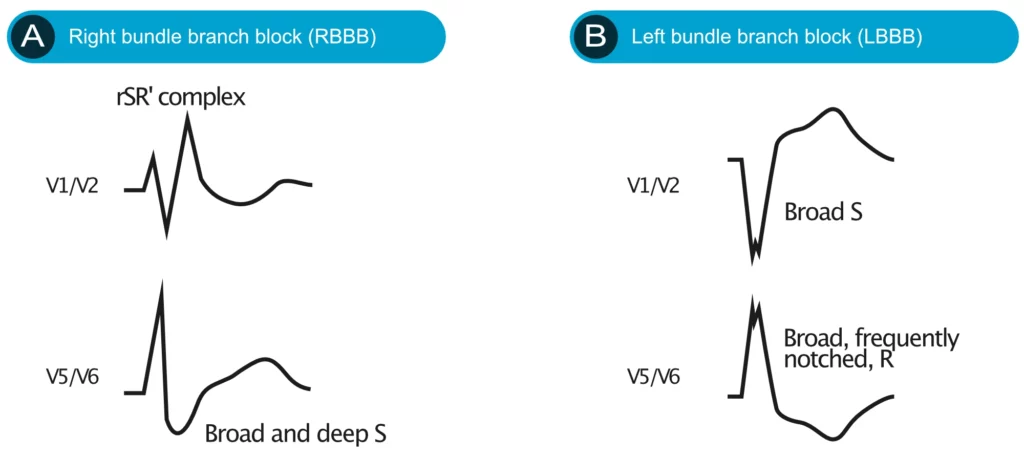 - Akutt koronart syndrom: Selv om RBBB ikke skjuler ST-elevasjoner på samme måte som LBBB, kan nyoppstått RBBB være assosiert med proksimal okklusjon av venstre arteria descendens (LAD), ettersom denne arterien forsyner septum og høyre gren. Dette er et høyrisikotegn ved fremre infarkt.