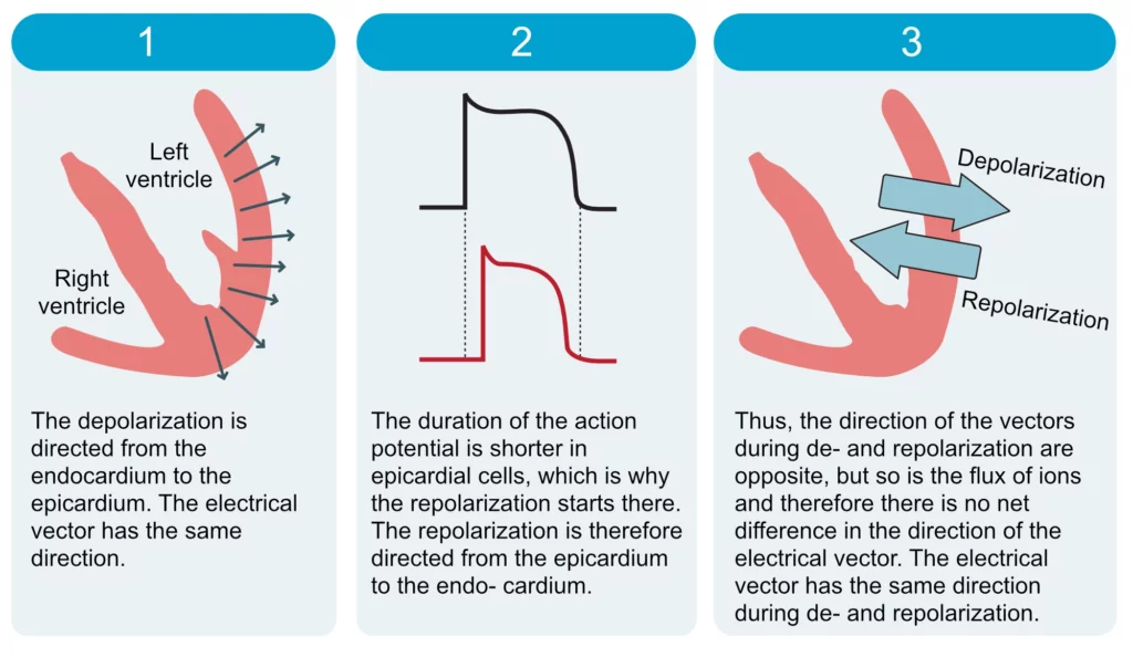 Det kan ved første øyekast virke ulogisk at QRS-komplekset (depolarisering) og T-bølgen (repolarisering) har samme retning på EKG, ettersom ionestrømmene er motsatte (innstrømming av Na⁺/Ca²⁺ vs. utstrømming av K⁺). Intuitivt kunne man forvente at motsatte prosesser ville gi elektriske signaler med motsatt polaritet. Forklaringen ligger i rekkefølgen på hendelsene:
