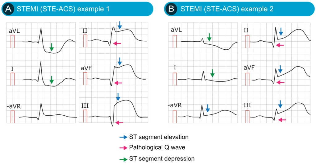 - STE-ACS (STEMI): Karakterisert ved vedvarende brystsmerter og signifikante ST-elevasjoner (eller ekvovalenter som nytt venstre grenblokk). Dette indikerer akutt totalokklusjon og krever umiddelbar reperfusjon. Diagnosen «Hjerteinfarkt» bekreftes formelt når troponinstigning foreligger, men behandlingen starter før dette svaret.