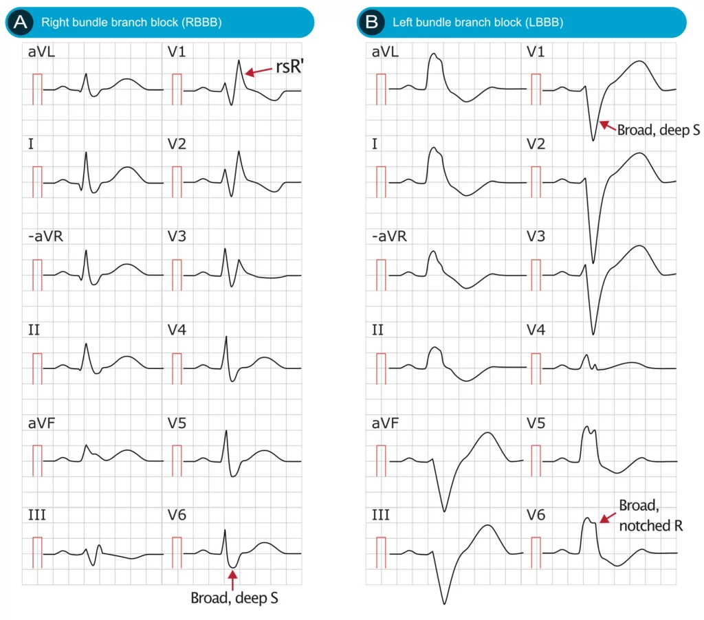 - Høyre ventrikulær ektopi: Ventrikulære ekstrasystoler (VES) eller ventrikkeltakykardi (VT) som oppstår i høyre ventrikkel vil ha LBBB-morfologi.
