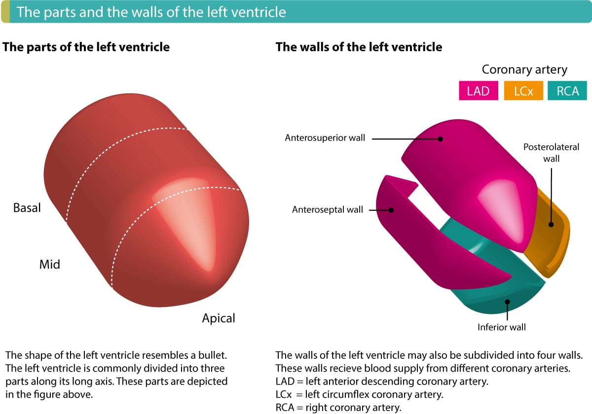 I EKG-diagnostikk og ekkokardiografi refererer lokalisasjonen av et infarkt primært til segmenter i venstre hjertekammer. For å systematisere dette deles venstre ventrikkel grovt inn i fire hovedvegger som korrelerer med koronarforsyningen: inferior (nedre), anterior (fremre), lateral og septal vegg (figur 2 nedenfor). Selv om moderne bildedannende diagnostikk ofte benytter en 17-segmentmodell for høyere presisjon, er den firedelte inndelingen fortsatt bærebjelken i akutt klinisk vurdering: